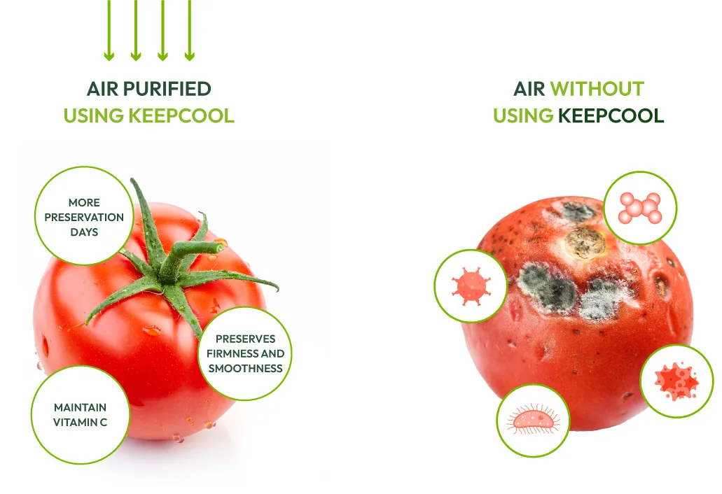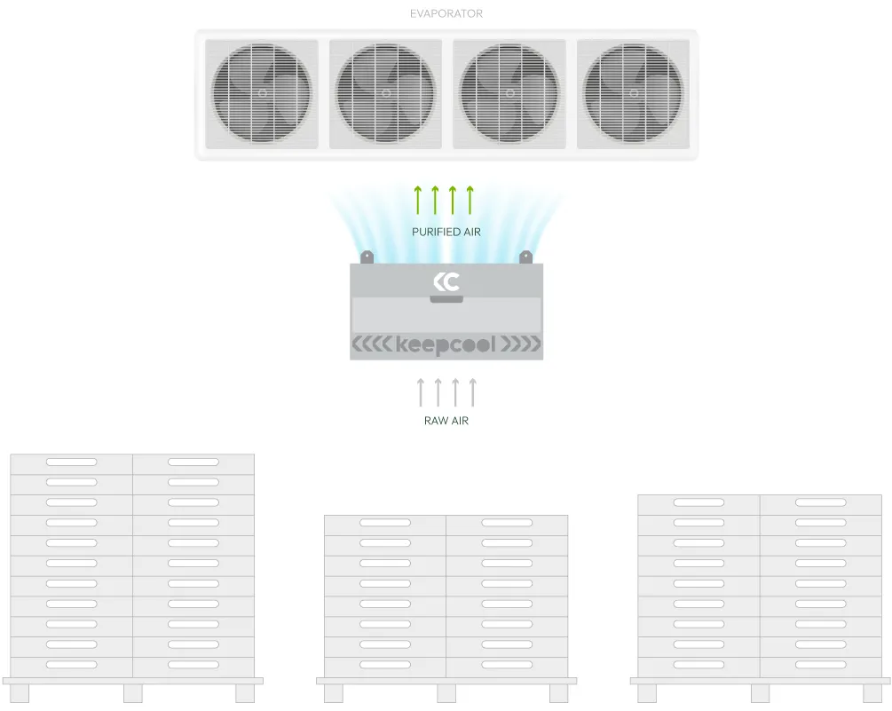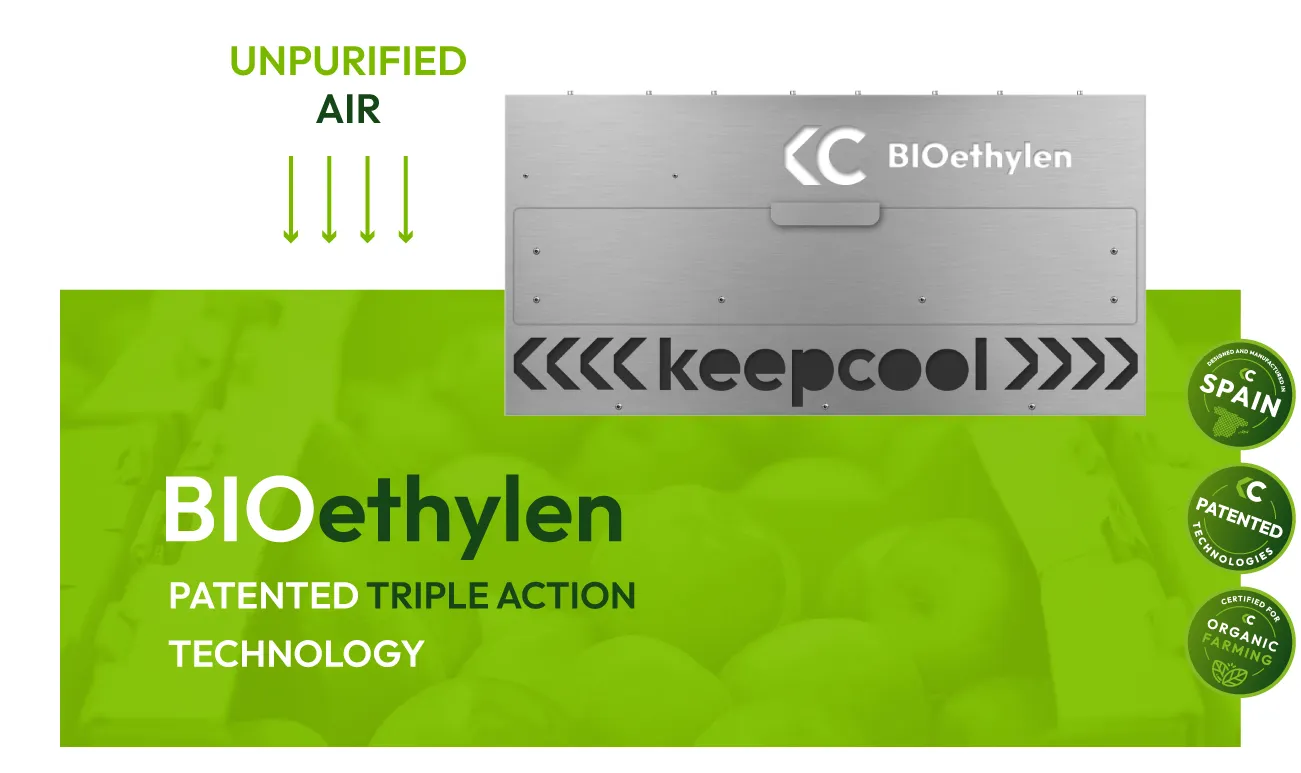 The BIOethylen equipment enhances air filtration by forcing it through the filters, thereby achieving greater ethylene absorption that delays ripening.